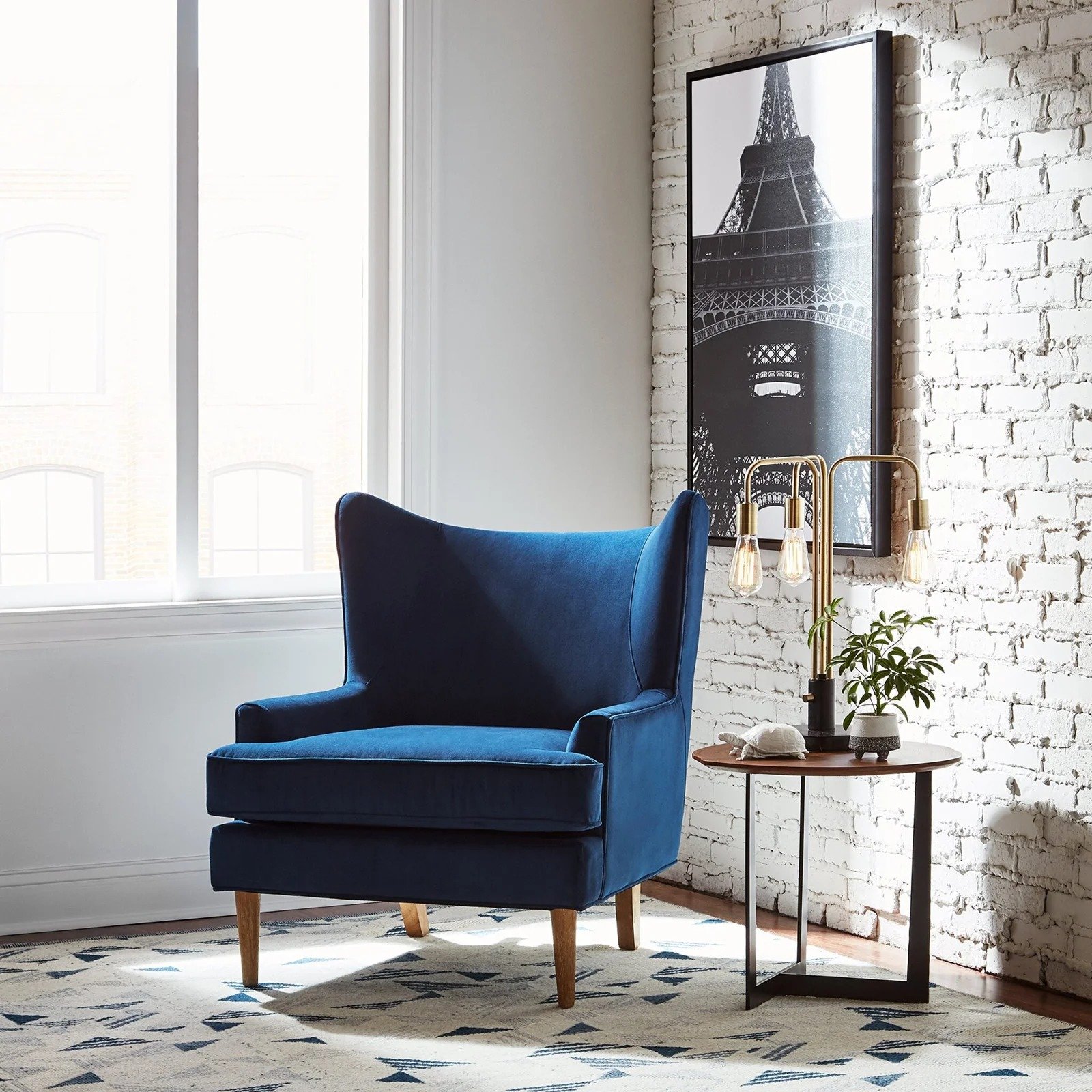 Deep-pile velvet upholstery with sculpted walnut legs.