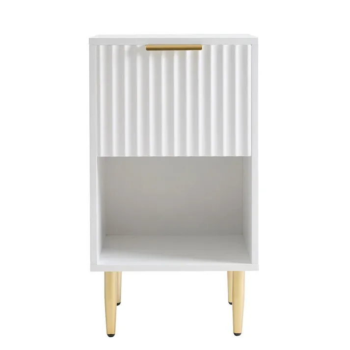 Featuring a spacious drawer for tucking away essentials and an open shelf for books or decorative accents, this nightstand combines smart storage with a modern, sophisticated look. The gold-toned handle and legs add just the right amount of luxury to make it a standout furniture addition.