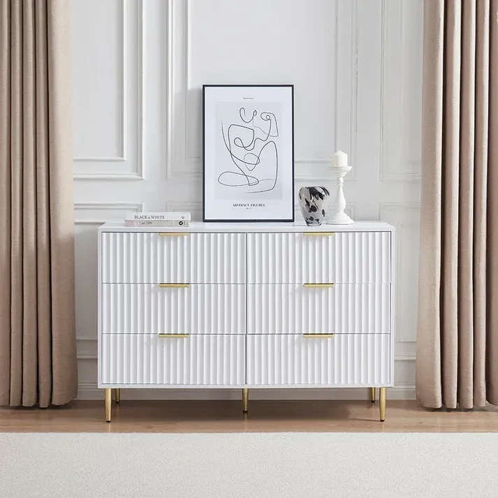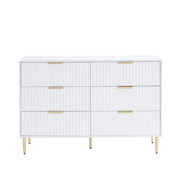 With smooth, curved lines and a symmetrical, ridged design, let this chest of 6 drawers really set the tone for your home. Delivered flat-packed and with plenty of storage for all of your favourite things, this chest has metal drawer runners for ease and durability, and has a matte-white painted finish. It also features gold-effect legs and cylindrical handles for a contemporary look and feel.